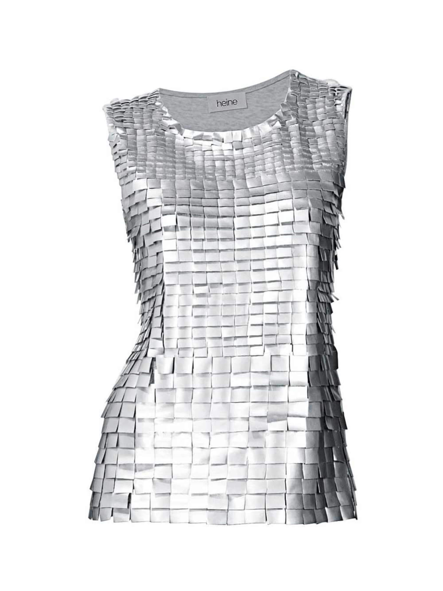 Ein strahlender Stern am Modehimmel, denn dieses Shirt macht Sie ganz klar zum Mittelpunkt des Geschehens! Vorn dicht mit Pailletten aus Lederimitat besetzt, hinten unifarben grau. Rundhalsausschnitt, angeschnittener Arm. Länge ca. 64 cm. Figurbetonte Form.
